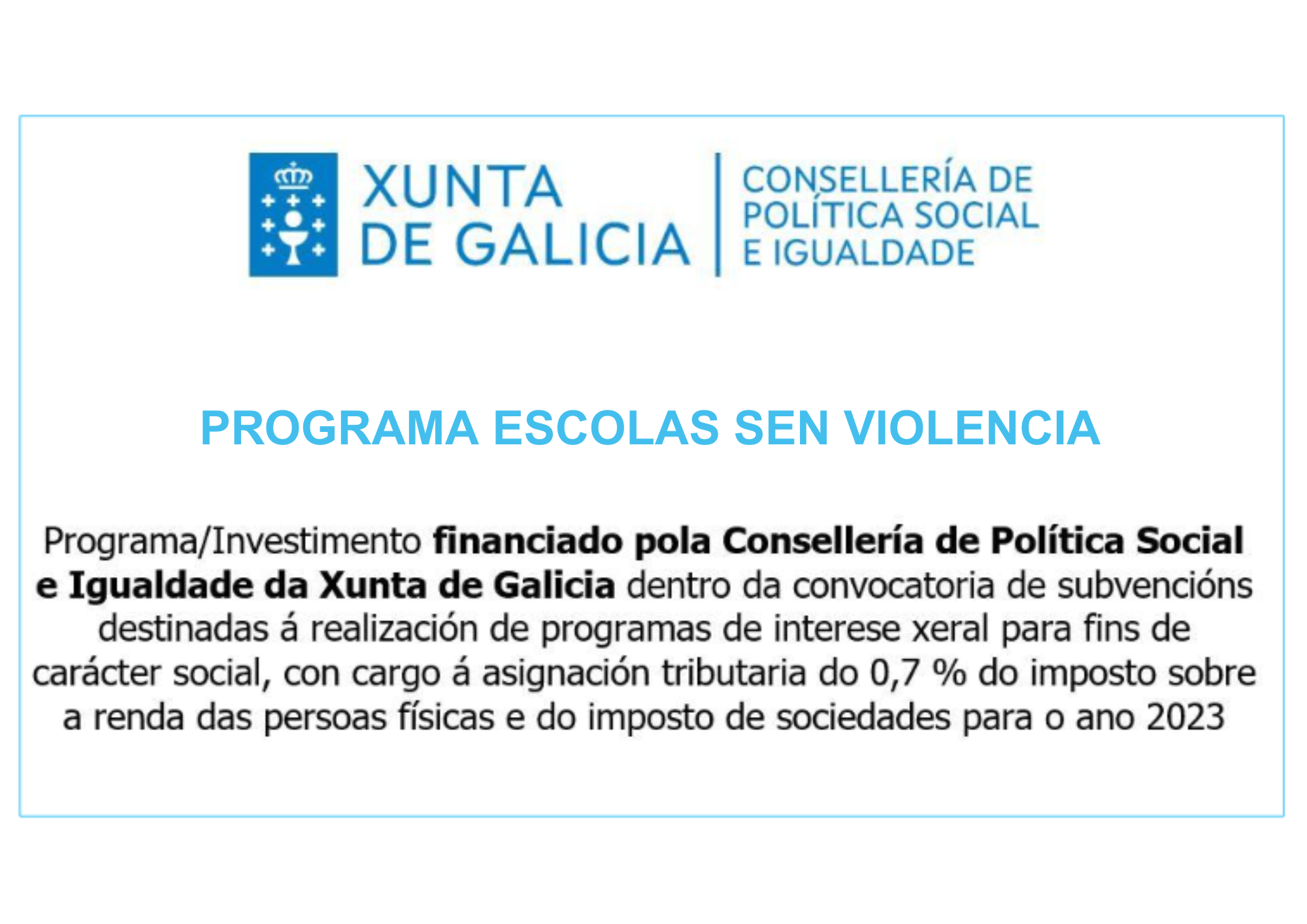 Escuelas sin violencia es un proyecto que nace en la fundación educativa y social Dignidad y que cuenta con la cofinanciación de la consellería de política social de la Xunta de Galicia mediante la convocatoria de subvenciones destinadas a realizar Programas de interés general para fines de carácter social con cargo a la Asignación tributaria del 0,7% del impuesto sobre la renta de las personas físicas y Del impuesto de sociedades.